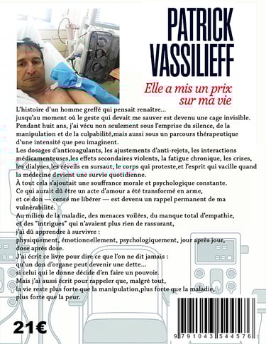 Pendant huit ans, Patrick VASSILIEFF a vécu ce que personne n’imagine : être sauvé par une greffe… puis menacé, manipulé, et détruit psychologiquement par celle qui lui avait donné un rein. Greffé d’un rein vivant en 2018, il découvre peu à peu que ce geste, considéré en France comme un acte d’amour, va devenir un outil d’emprise émotionnelle, un moyen de chantage, et une source permanente de culpabilisation.